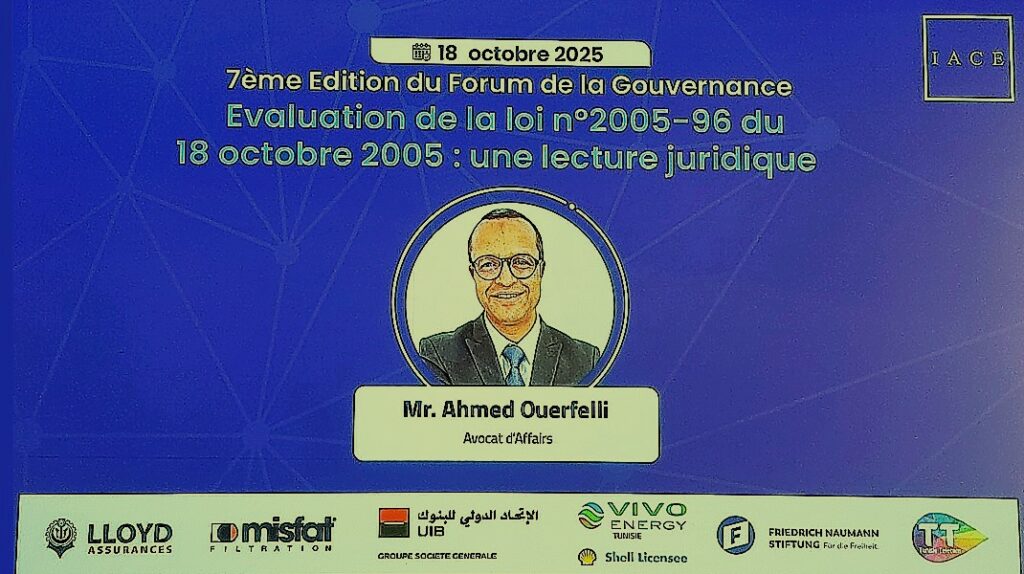 La-Femme (IACE – 7e Forum de la Gouvernance) – Tunis, le 18 octobre 2025 – En tant que co-rédacteur du projet de la Loi 2005-96 sur la sécurité financière, Maître Ahmed Ouerfelli, Avocat d’Affaires, a livré une analyse détaillée de cette législation lors du 7e Forum de la Gouvernance de l’IACE. Il a souligné que le texte représentait une « avancée évidente » pour le droit des affaires tunisien, mais qu’il nécessitait des mises à jour majeures, notamment pour renforcer l’indépendance et la transparence.